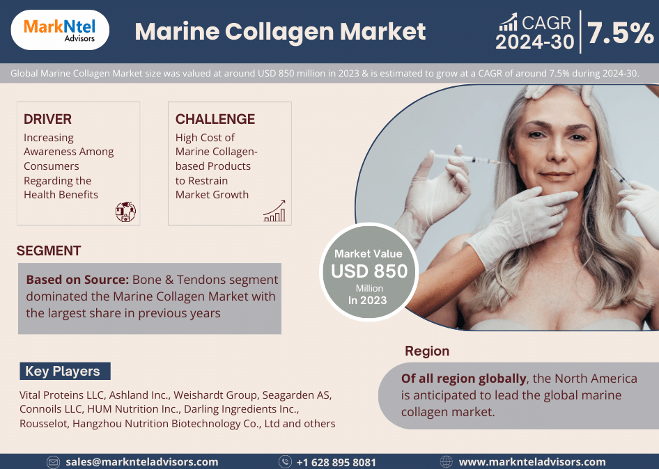 MarkNtel Advisors recently published a detailed industry analysis of the Marine Collagen Market. The report covers growth trends, geographical marketing strategies, challenges, opportunities, and drivers influencing the market.