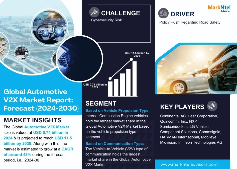 MarkNtel Advisors recently published a detailed industry analysis of the Automotive V2X Market. The report covers growth trends, geographical marketing strategies, challenges, opportunities, and drivers influencing the market.